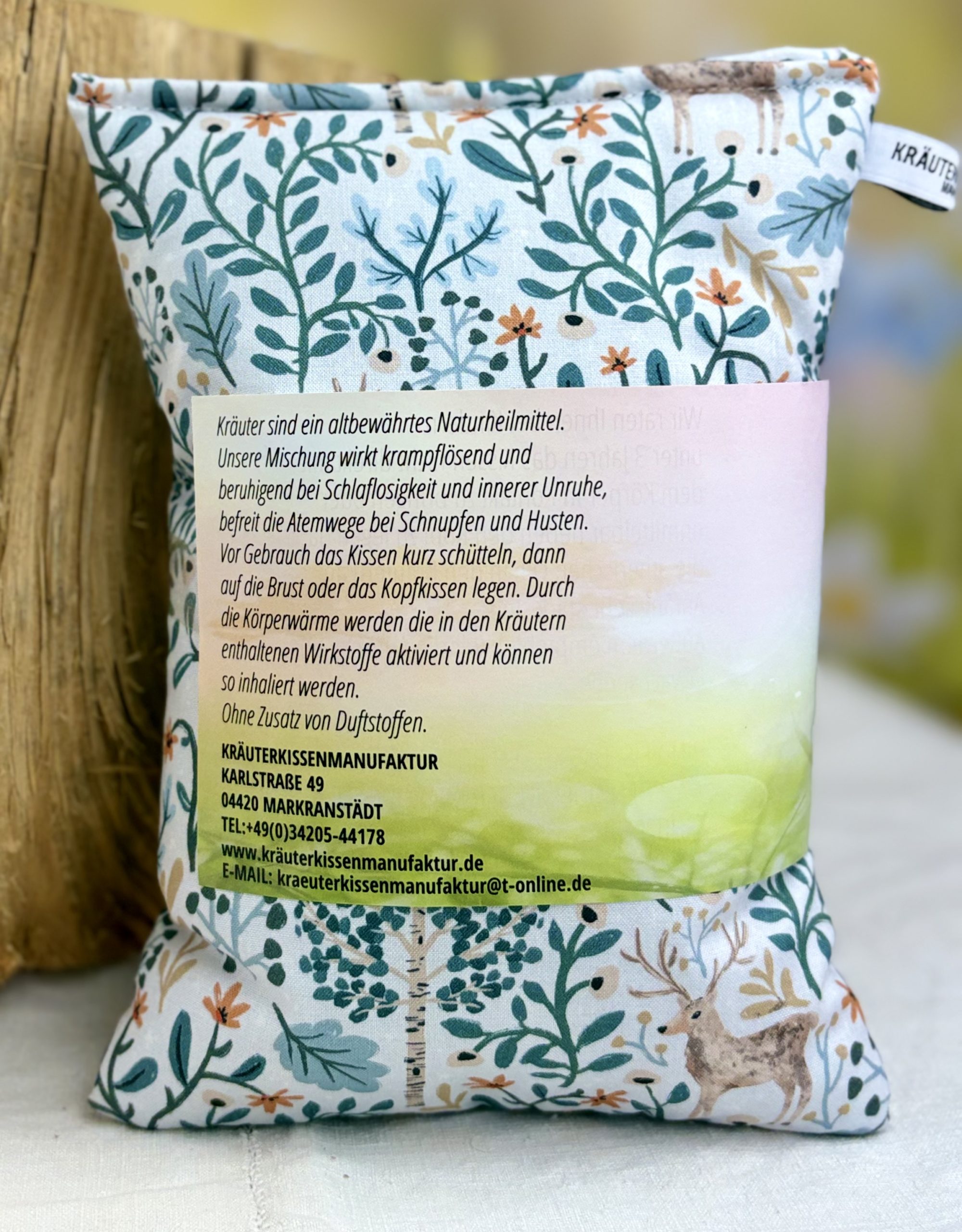 Kräuter sind ein alt bewährtes Naturheilmittel. Unsere Mischung aus Minze, Rosmarin, Quendel, Hopfen, Ysopkraut, Lavendel, Rosenblütenblättern und Melisse, wirkt beruhigend und krampflösend bei Schlaflosigkeit und innerer Unruhe. Befreit die Atemwege bei Schnupfen und Husten.Vor Gebrauch das Kissen kurz schütteln, dann auf die Brust oder das Kopfkissen legen. Durch die Körperwärme werden die in den Kräutern enthaltenen Wirkstoffe aktiviert, und können so inhaliert werden. Ohne Zusatz von Duftstoffen.